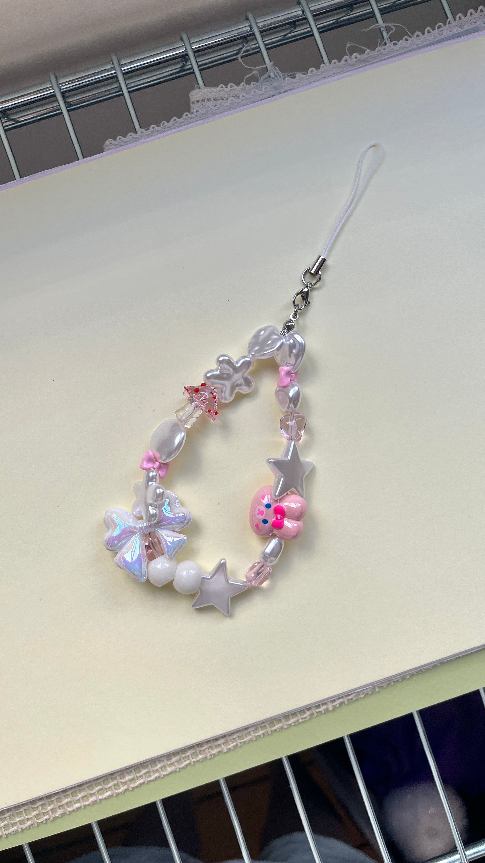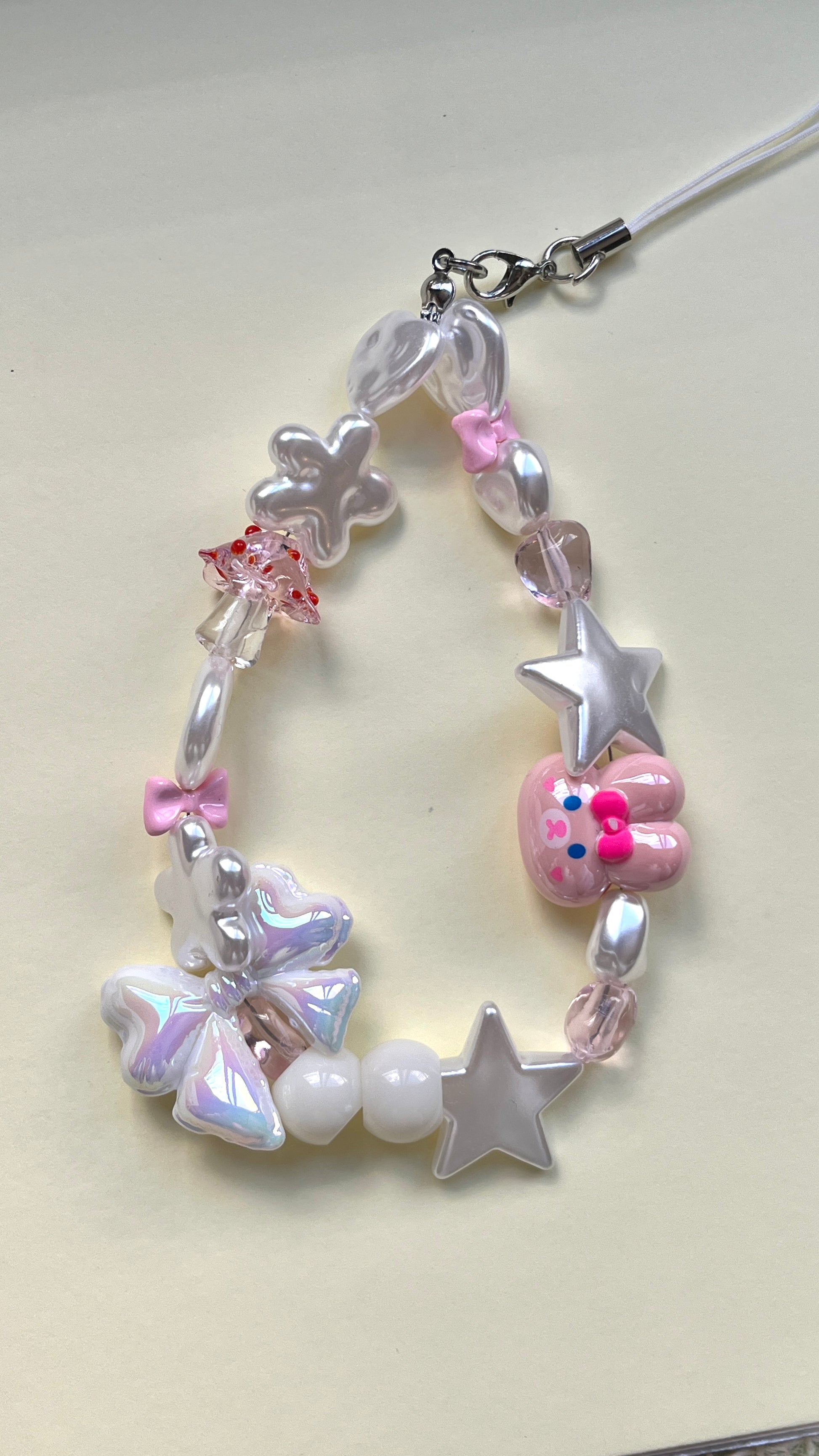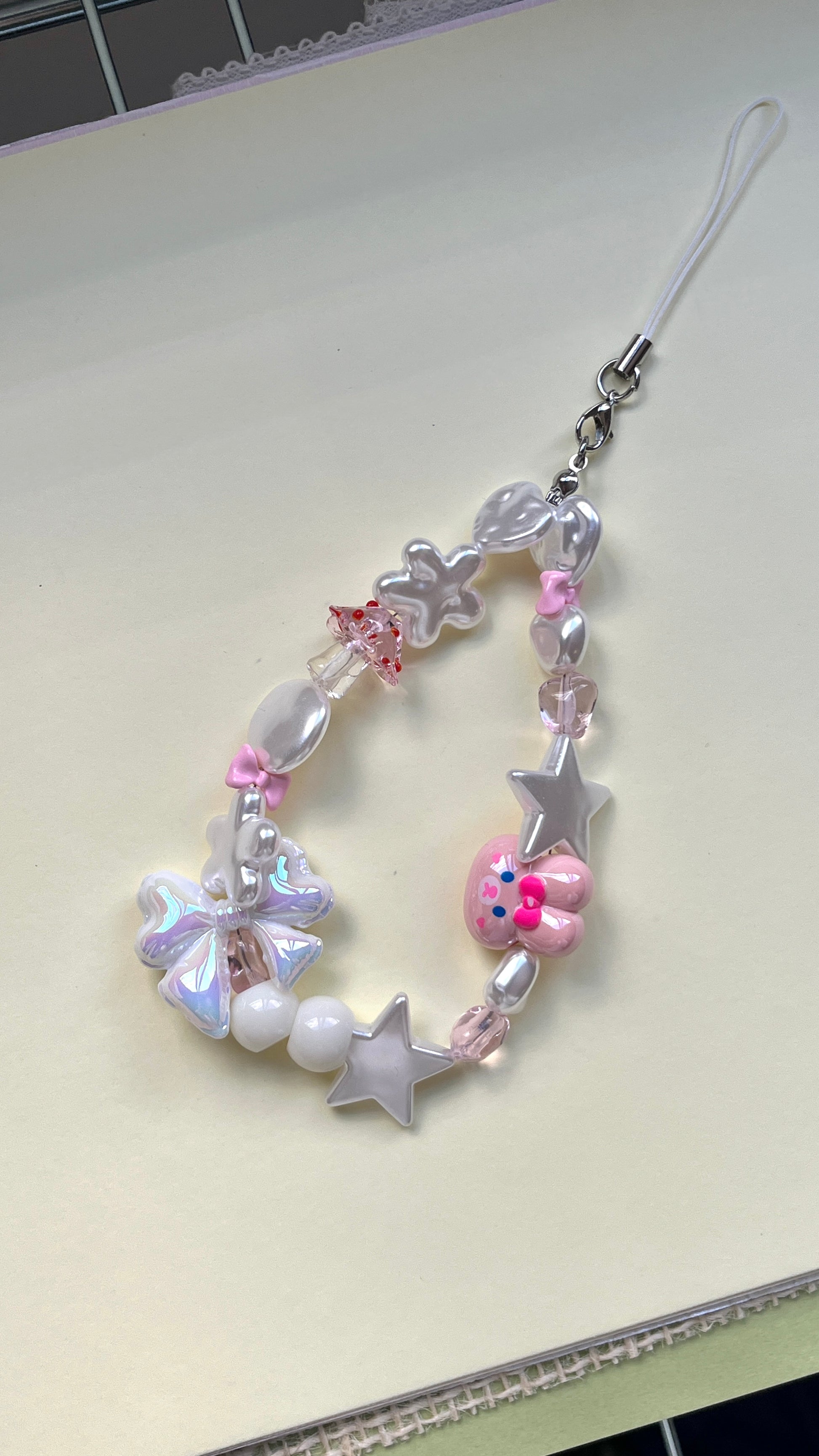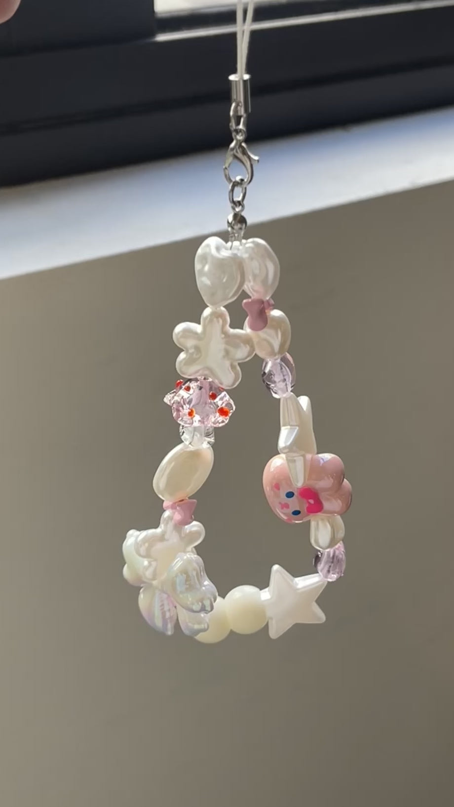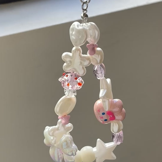 This handmade Bunny House phone strap or keyring features a charming bunny accented with various pink-ish beads. The careful arrangement of acrylic pearls and dynamic beads adds a touch of liveliness, making it a stylish accessory that enhances both your keys and phone with a delicate, playful appeal. Perfect for those who appreciate subtle craftsmanship and unique design.