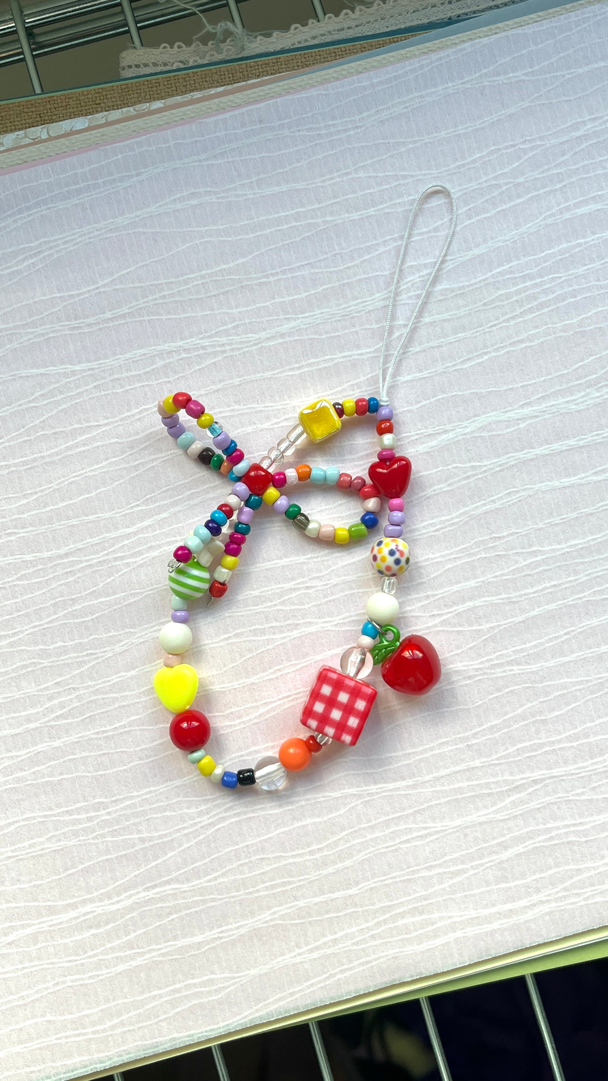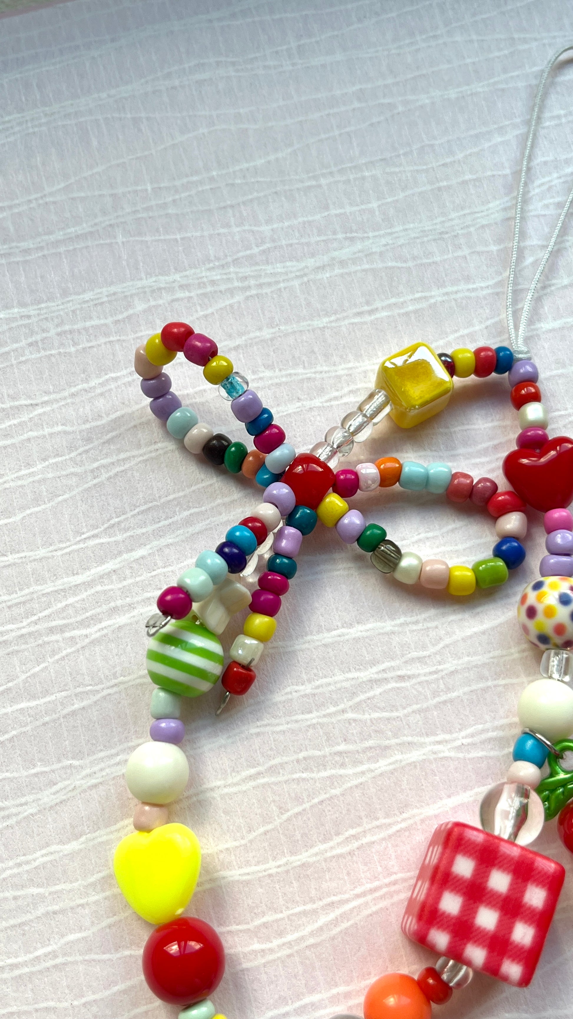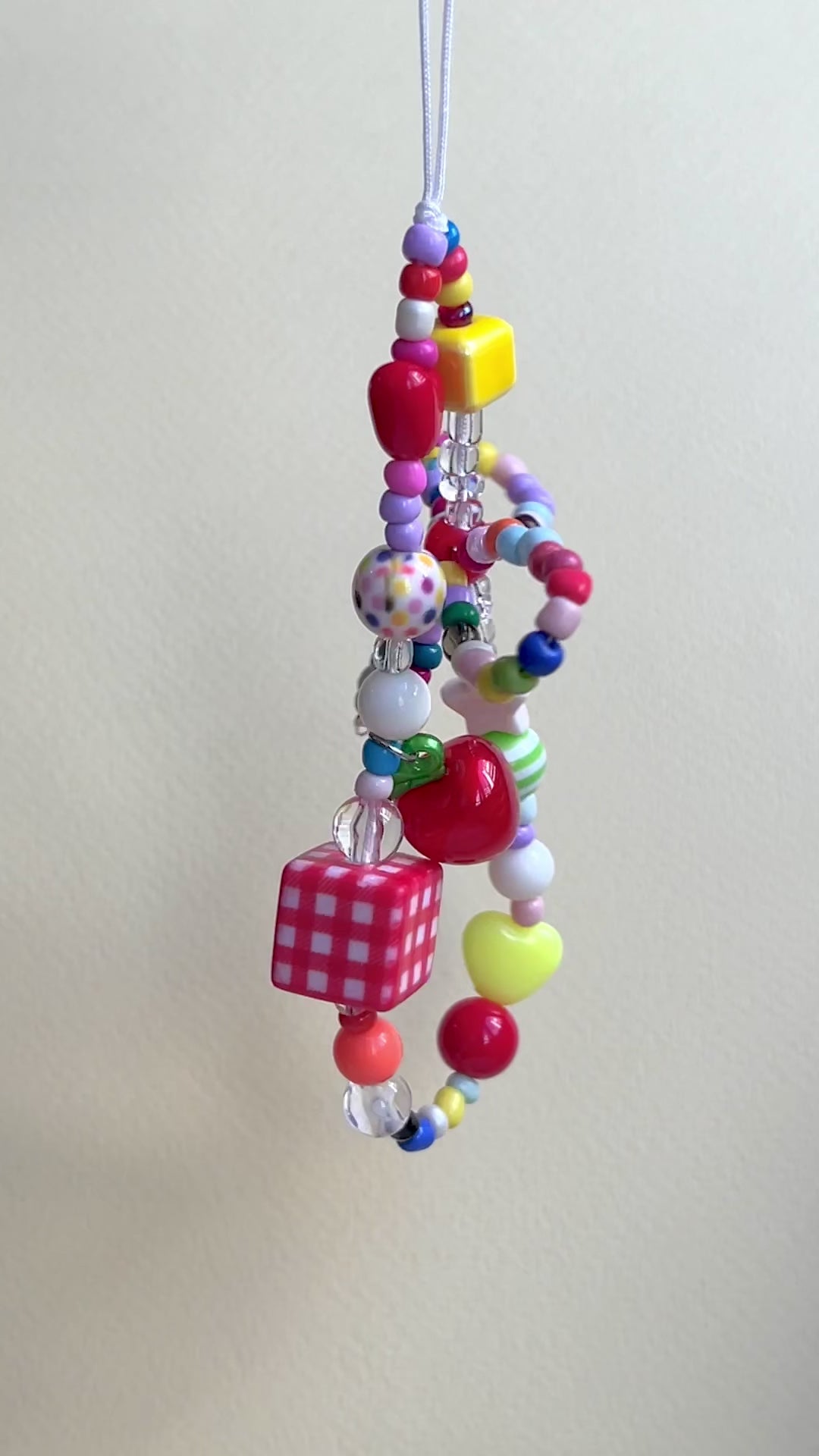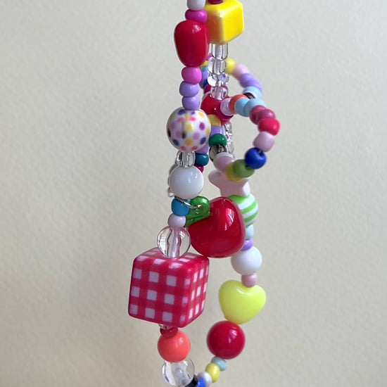 The Handmade Cherry Jubilee phone strap or keyring features a charming mix of colorful beads, including playful dice and cherry shapes, threaded on a delicate beaded ribbon. This vibrant accessory brings a lively pop of color and whimsical detail that effortlessly enhances any simple outfit, combining practical use with standout style.