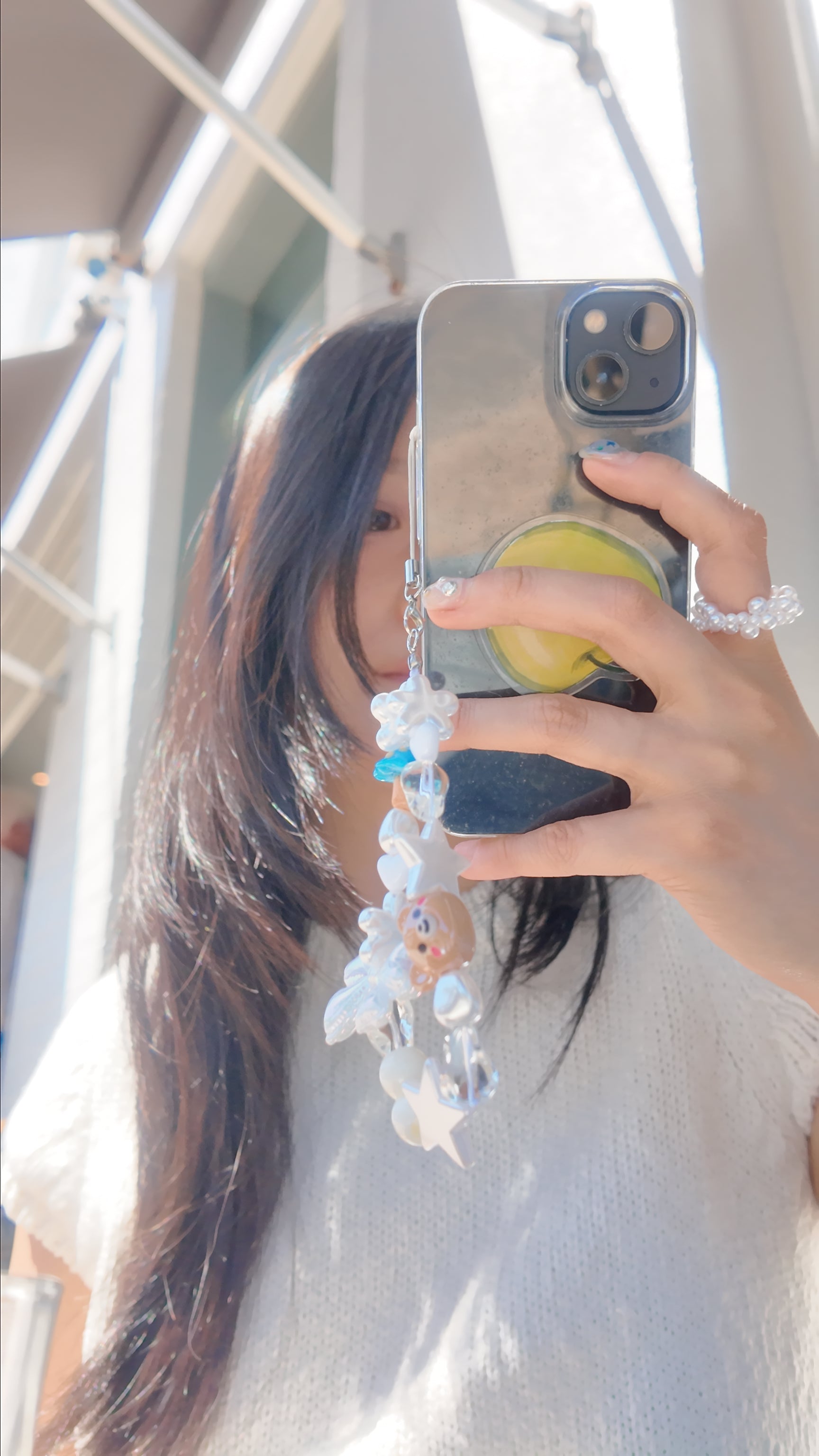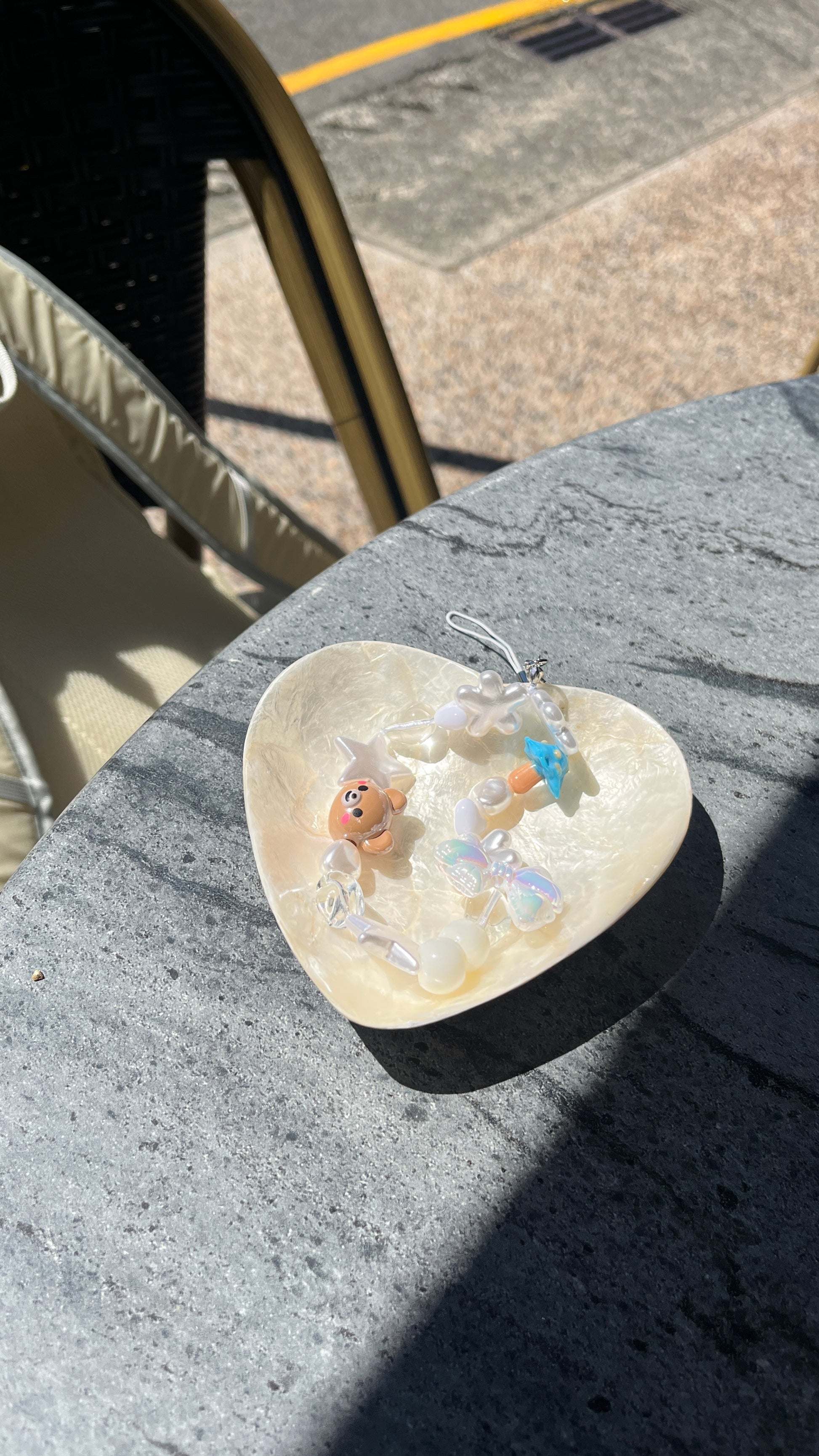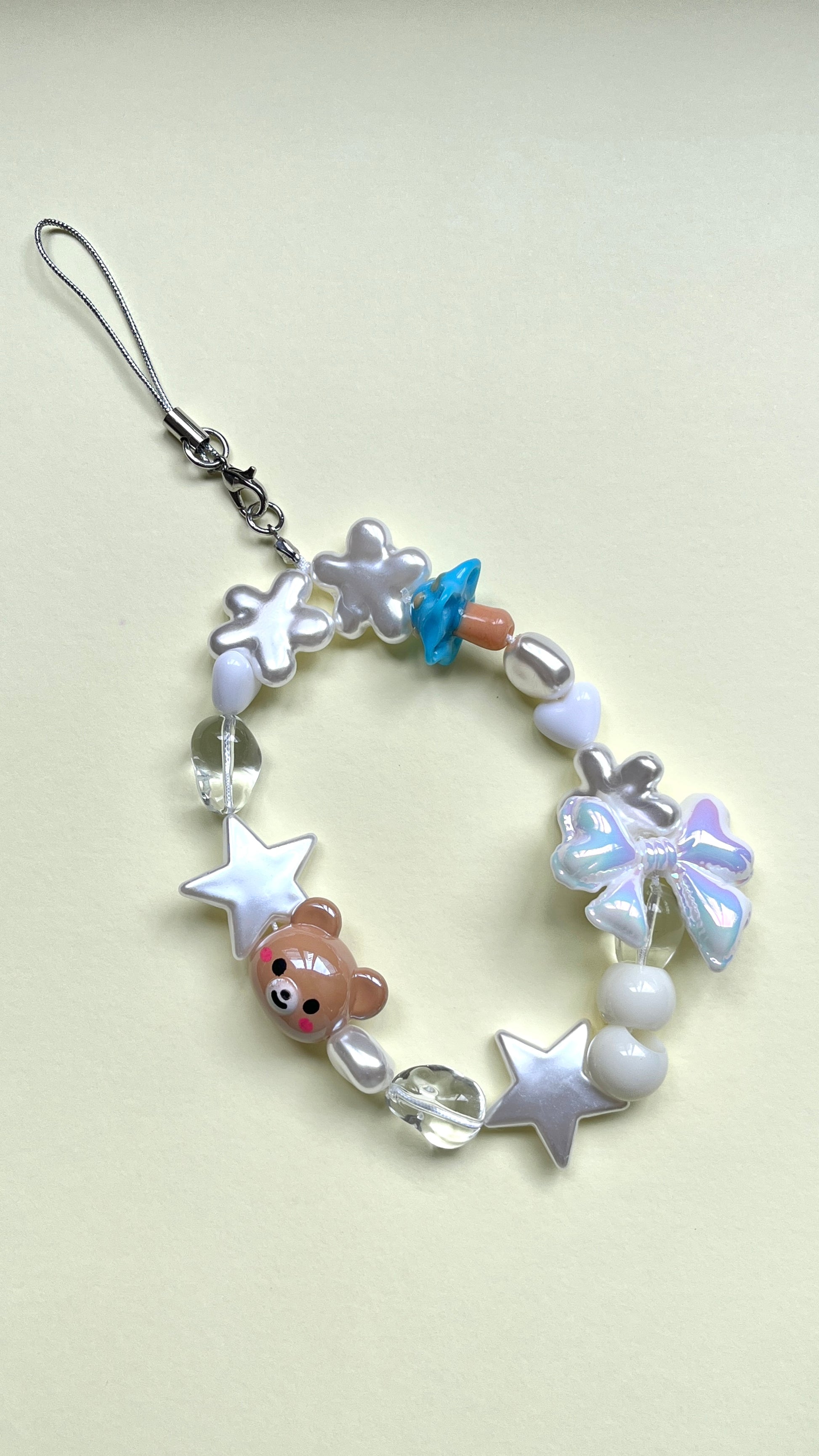 This Handmade Teddy House phone strap or keyring features a carefully balanced white color palette, blending iridescent, pearl, and transparent beads for a subtle, elegant shine. Adorned with a charming teddy bear and a delicate mushroom bead, it adds a touch of playful sophistication while securely holding your essentials. Perfect for those who appreciate unique, handcrafted accessories with refined details.