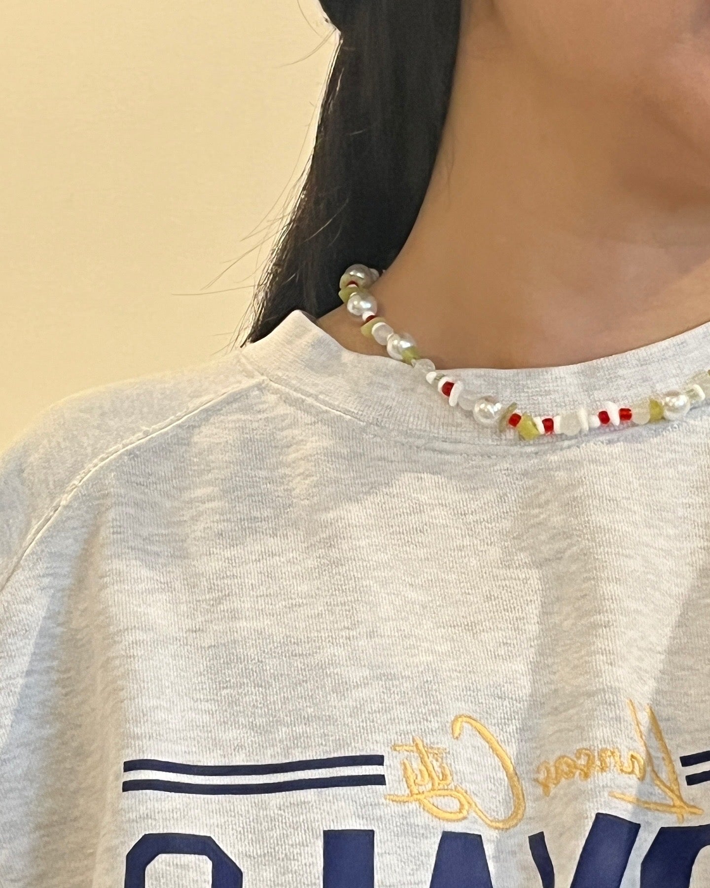 A beaded necklace that brings a refreshing twist—Green and red beads play together in a bold yet breezy combo, blending gemstones, acrylic pearls, and glass beads into one vibrant piece. Wear it when you want your look to feel fresh, fun, and a little unexpected!