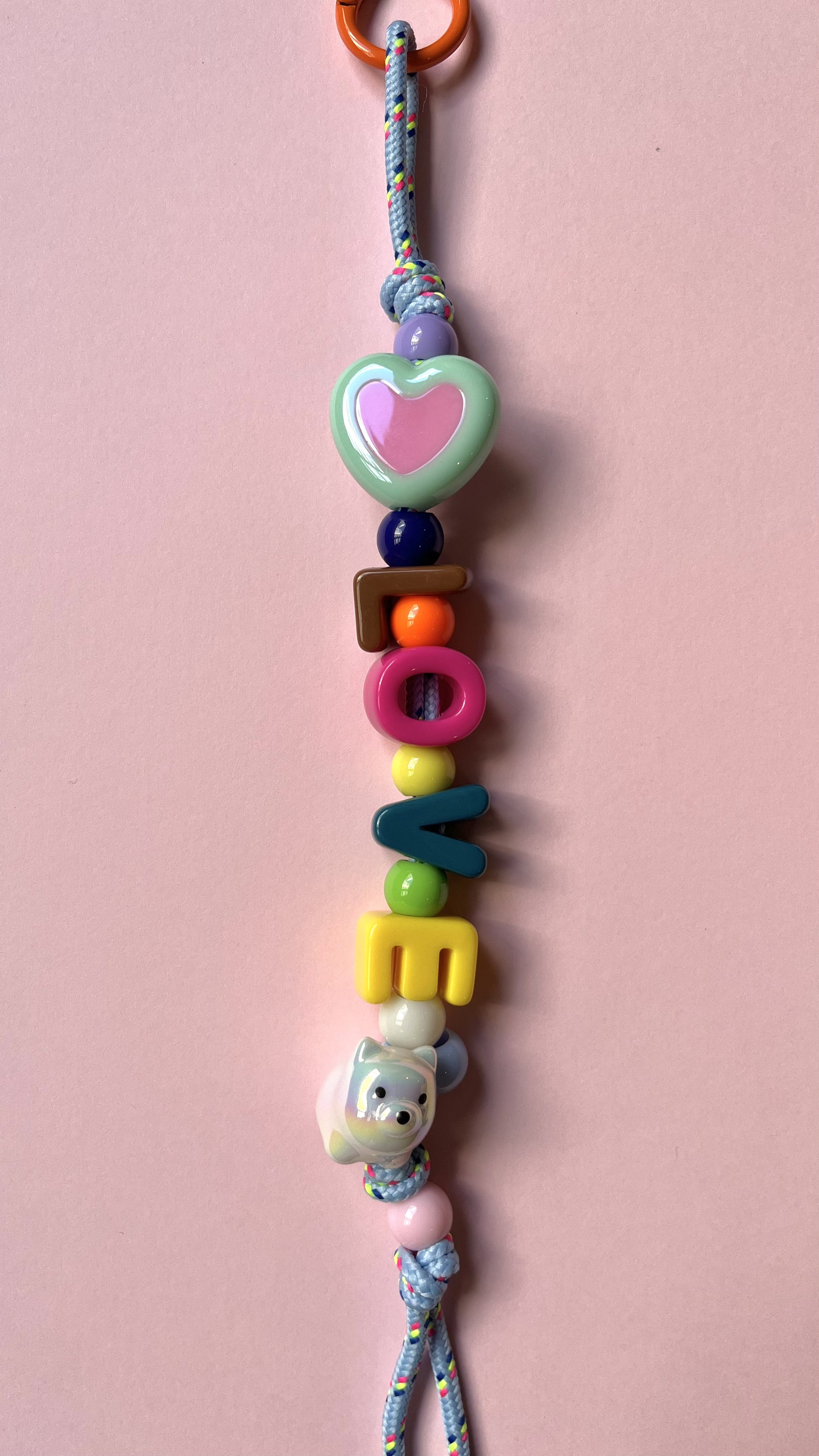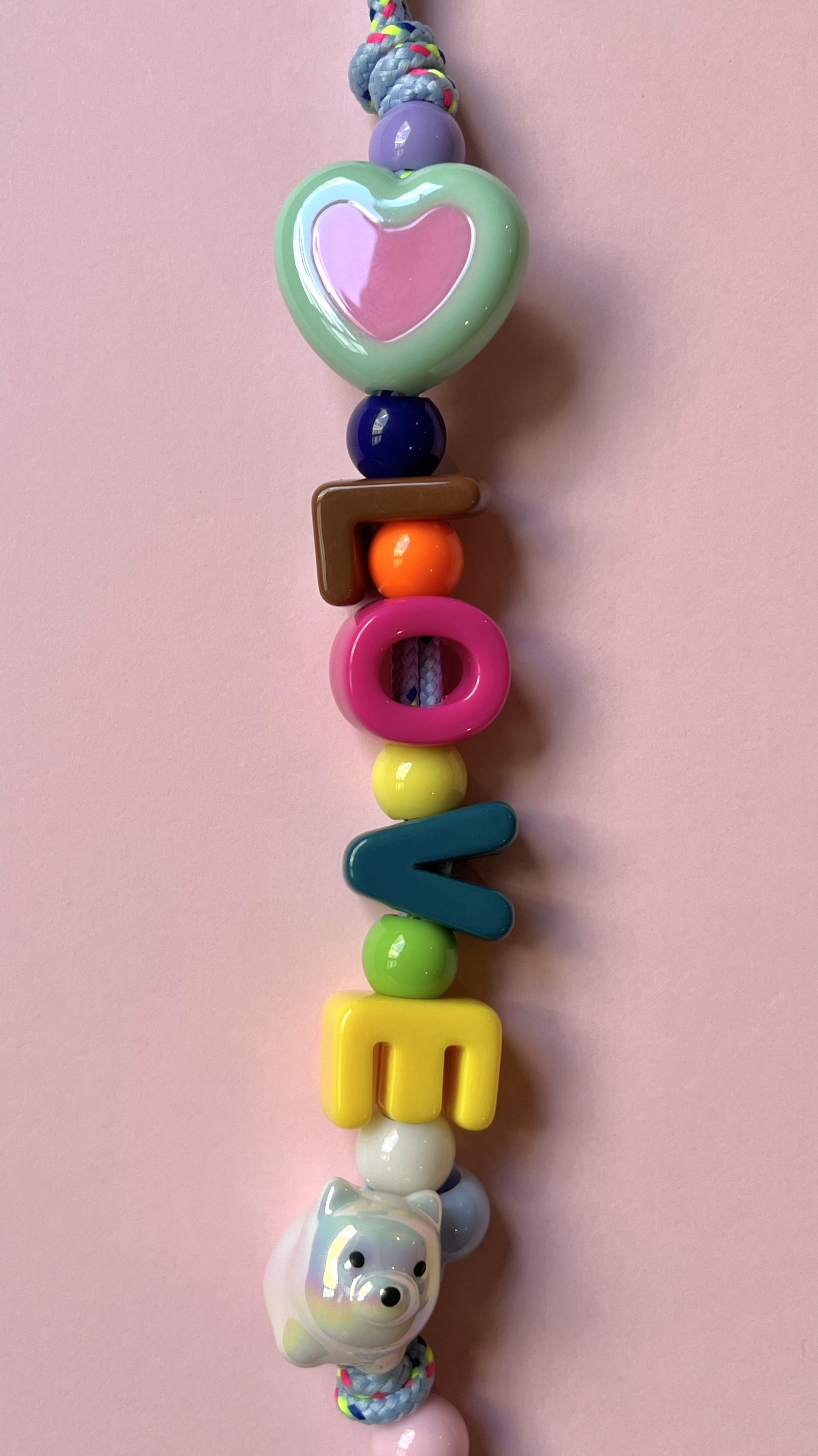 This playful beaded key holder is full of charm. With chunky, colorful beads, fun little details like clouds, hearts, and tiny animals, and bold L-O-V-E lettering in cheerful tones.