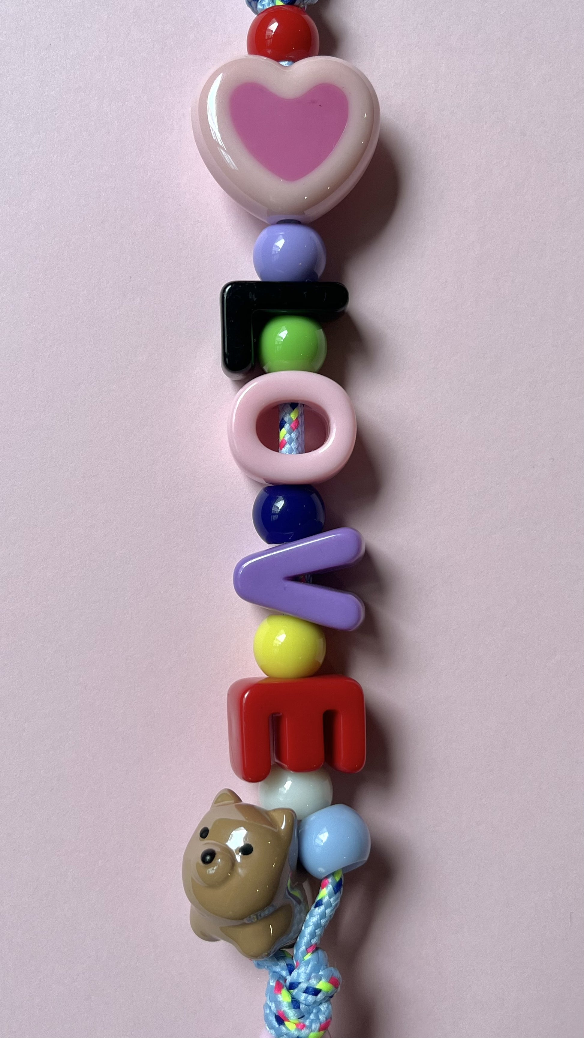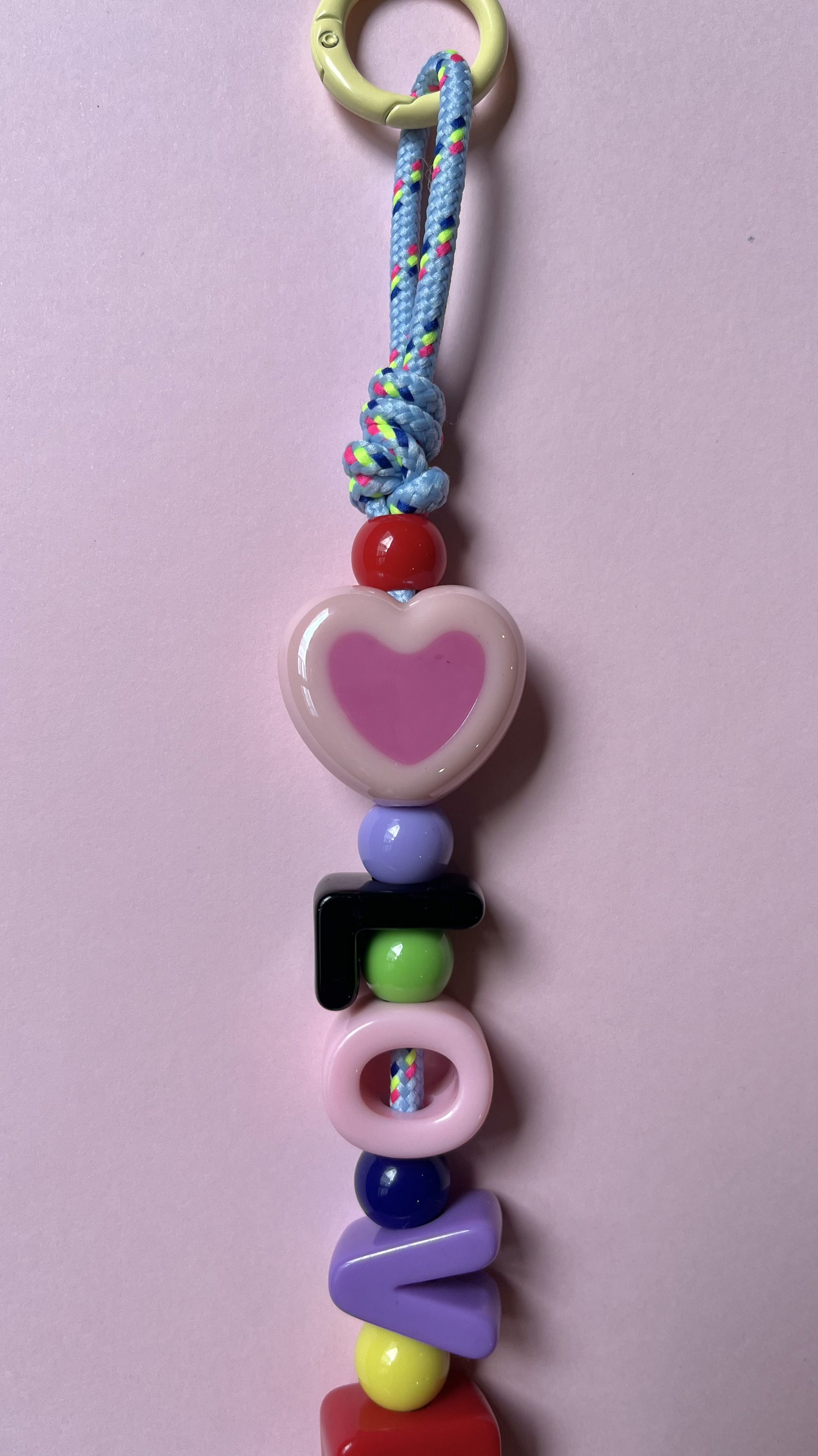 This playful beaded key holder is full of charm. With chunky, colorful beads, fun little details like clouds, hearts, and tiny animals, and bold L-O-V-E lettering in cheerful tones.