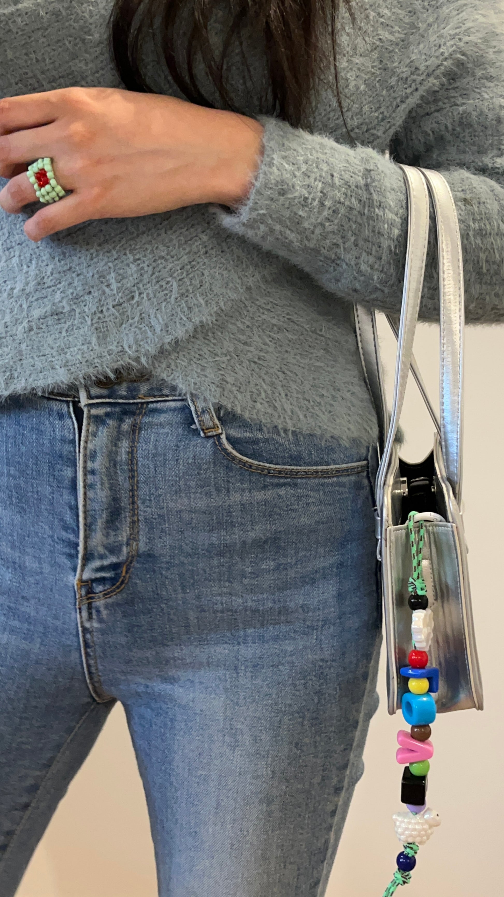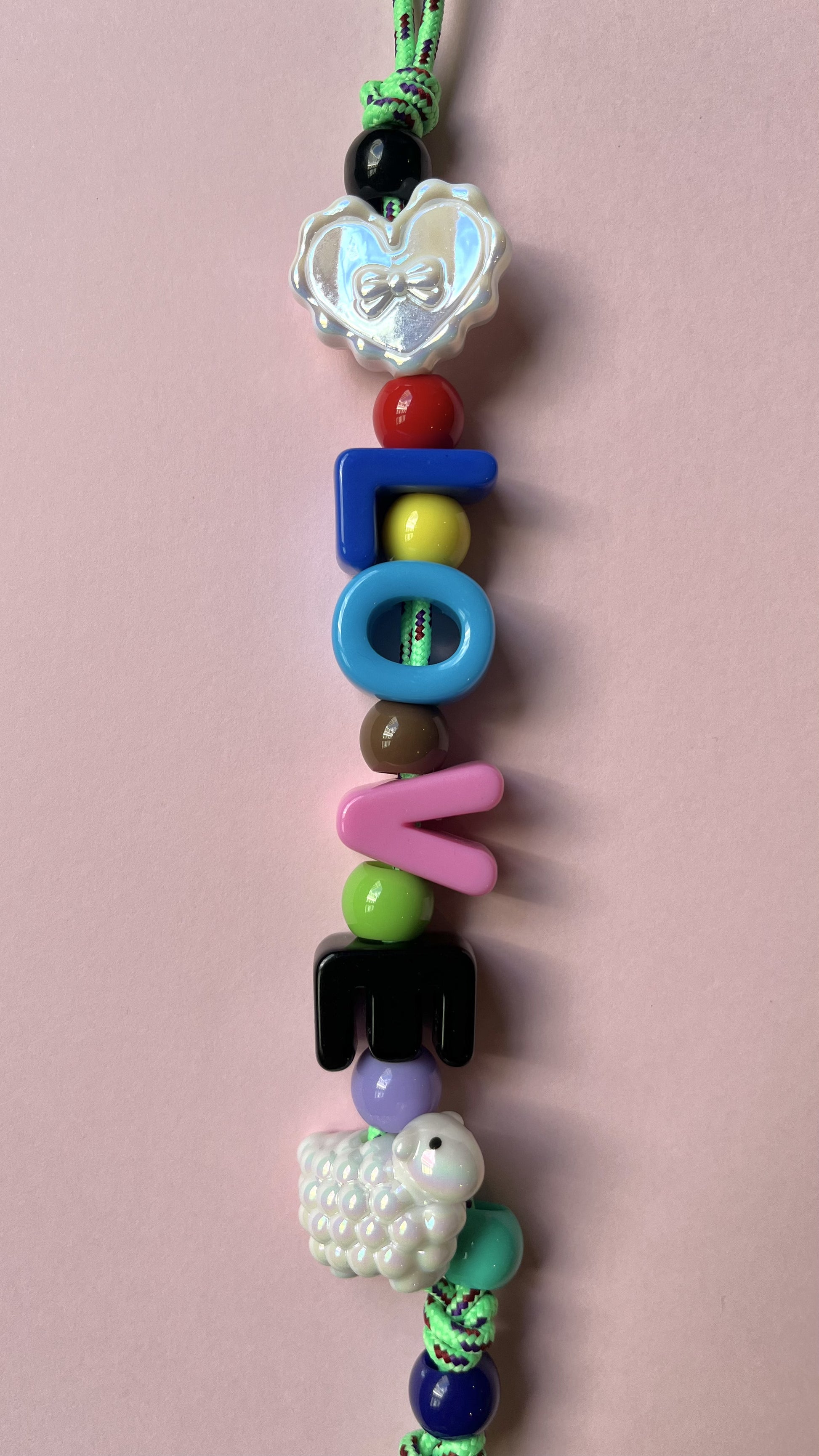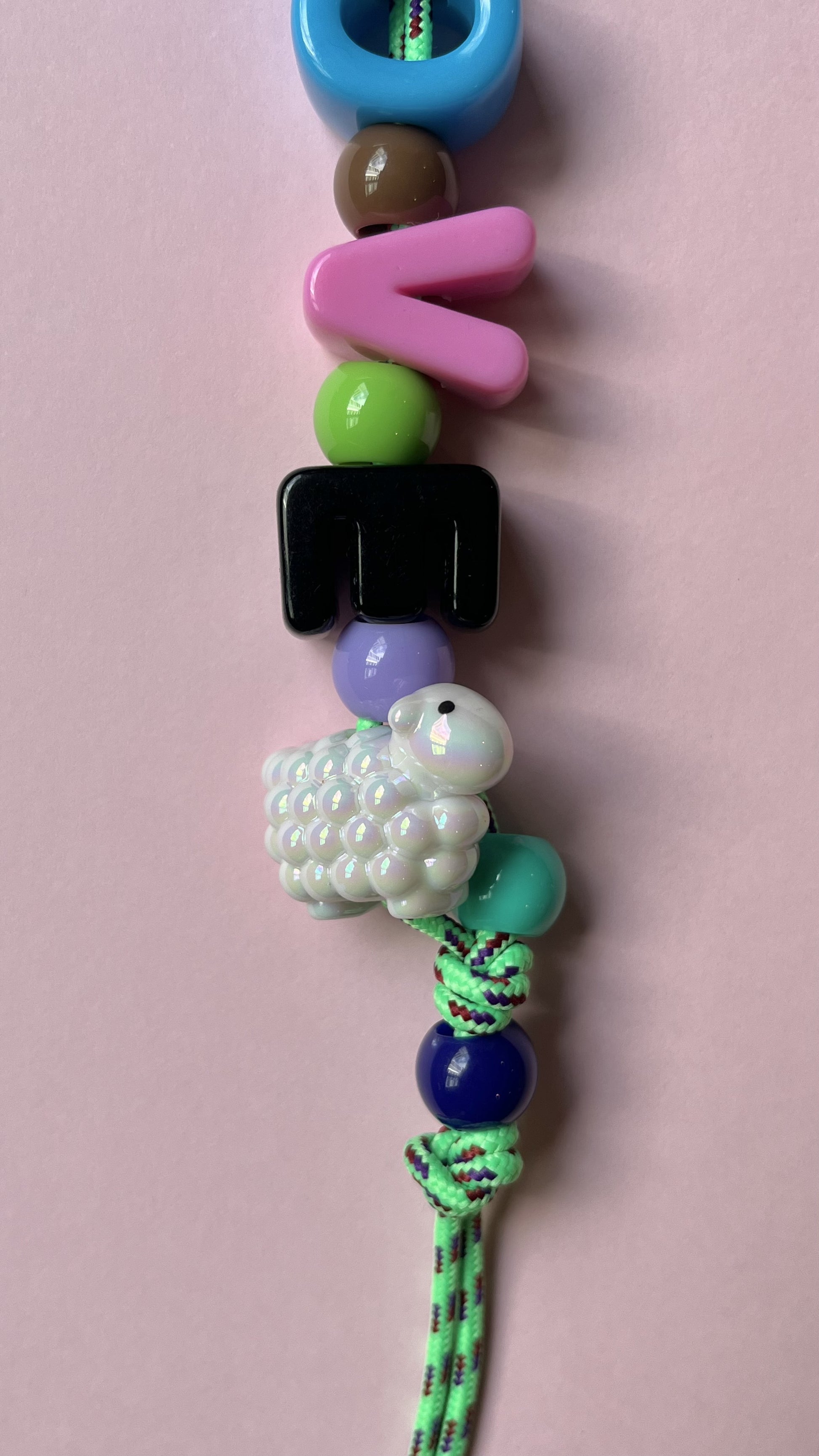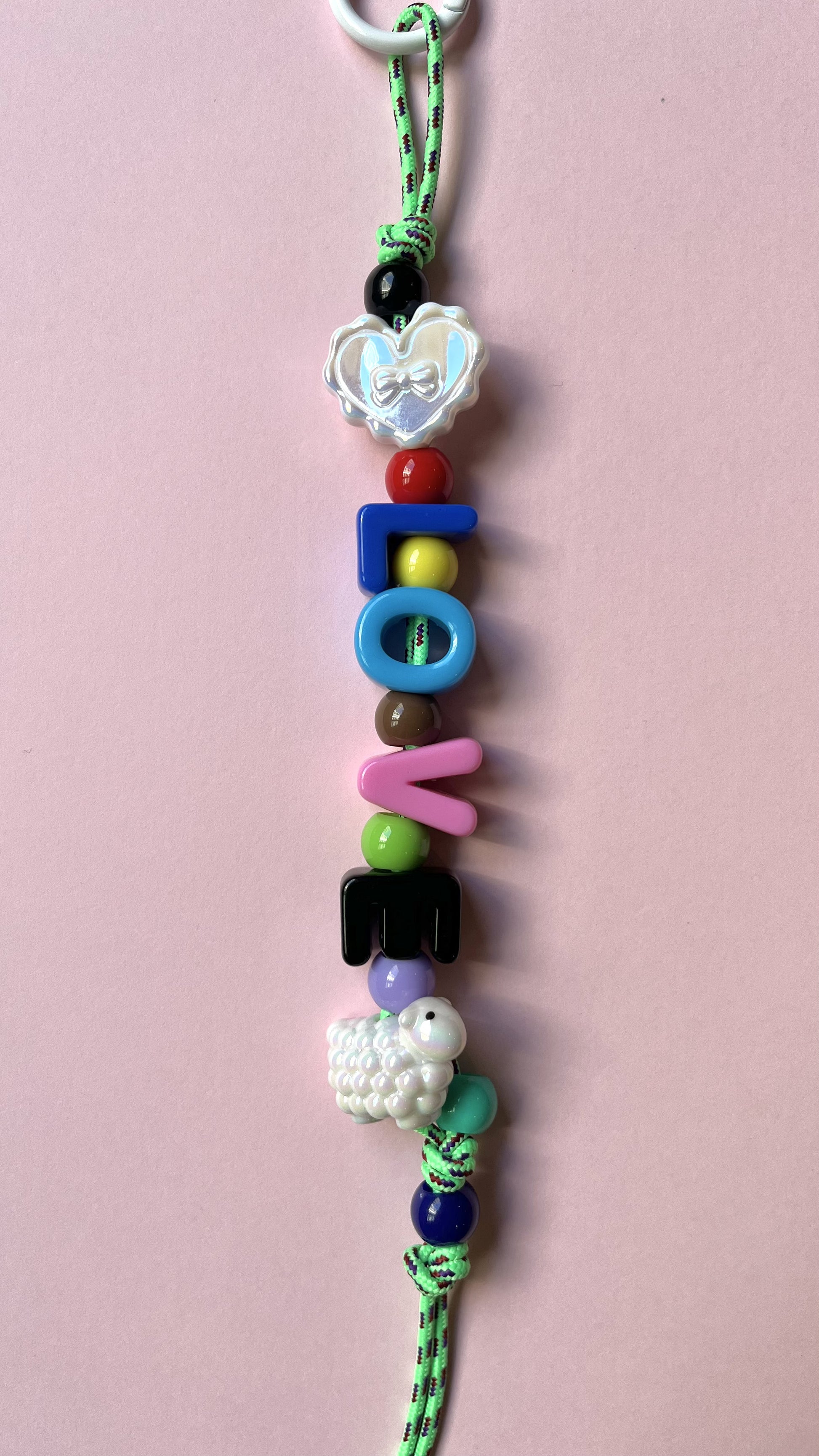 This playful beaded key holder is full of charm. With chunky, colorful beads, fun little details like clouds, hearts, and tiny animals, and bold L-O-V-E lettering in cheerful tones.